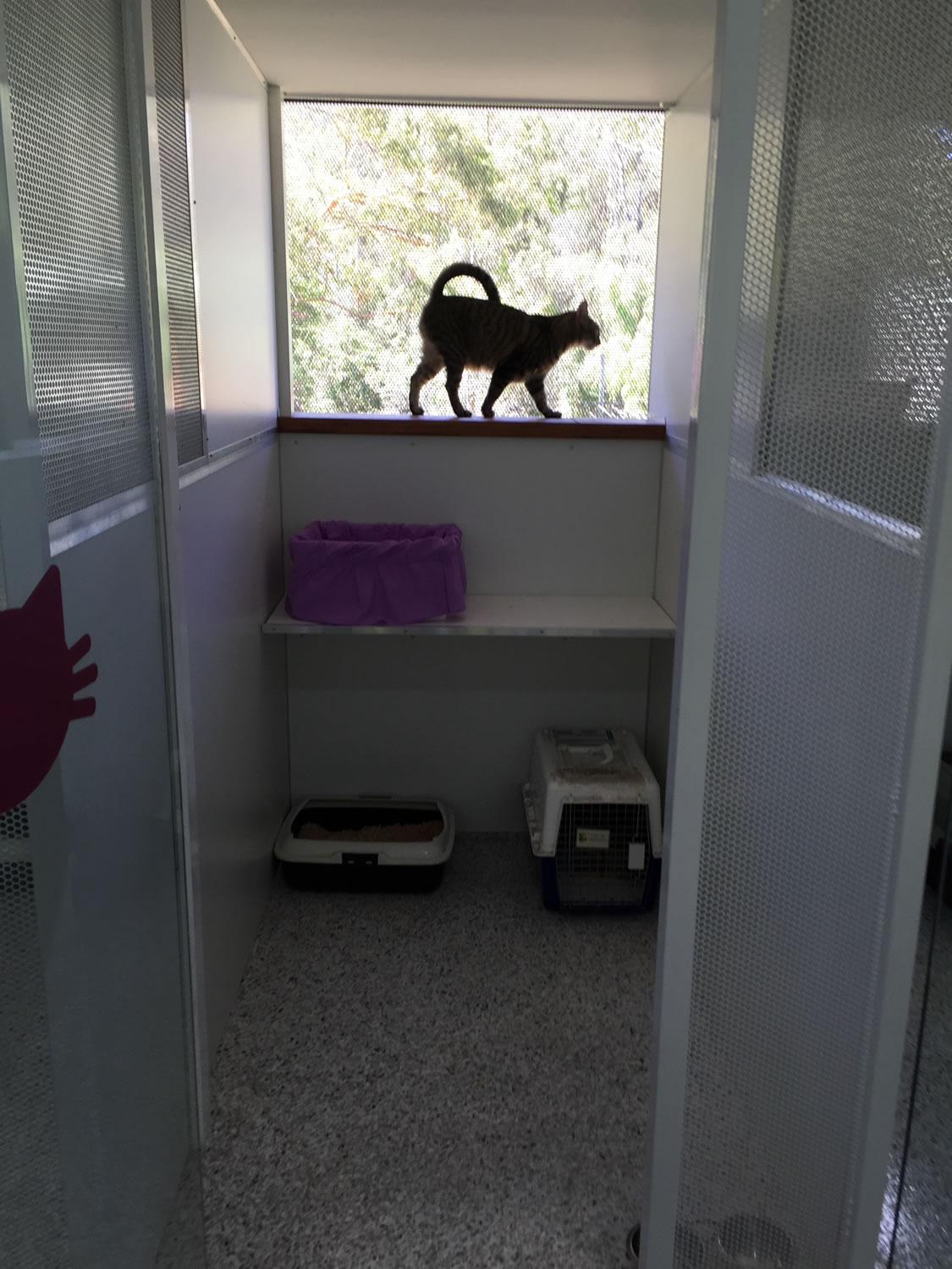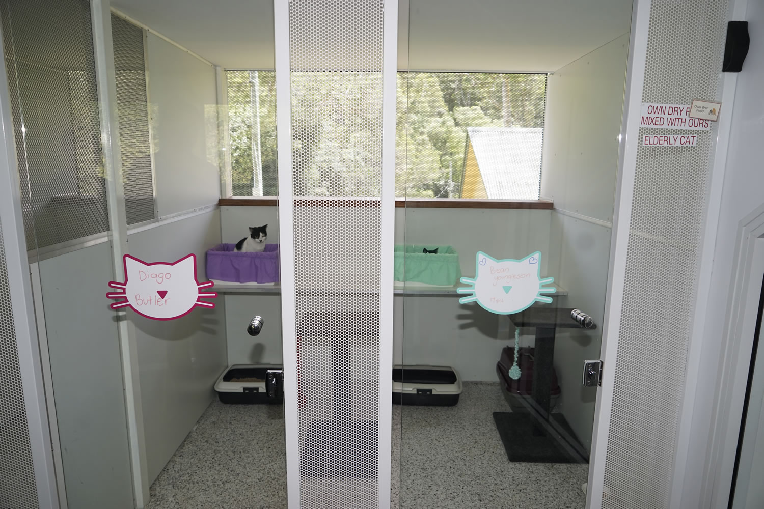 Each of the 28 beautiful, light filled walk-in rooms have individual scratchy poles for play time and a balcony for furry loved ones to sit on and watch the world go by. It has been designed so each cat cannot see their neighbour so they feel totally private in their own oasis.